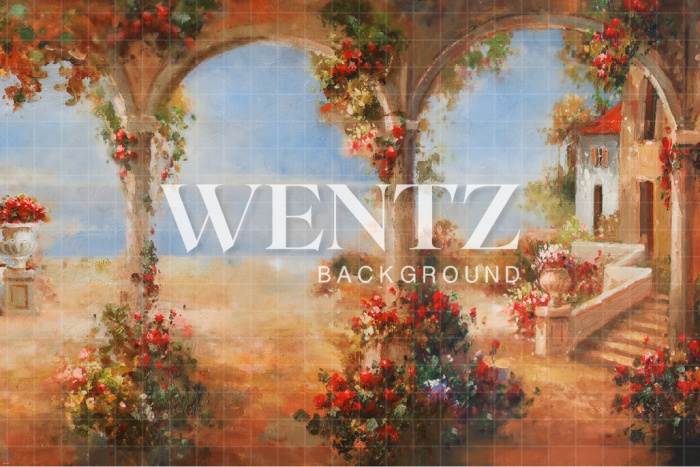 Fabric Photography Background Flowers Village With Arches / Backdrop CW48